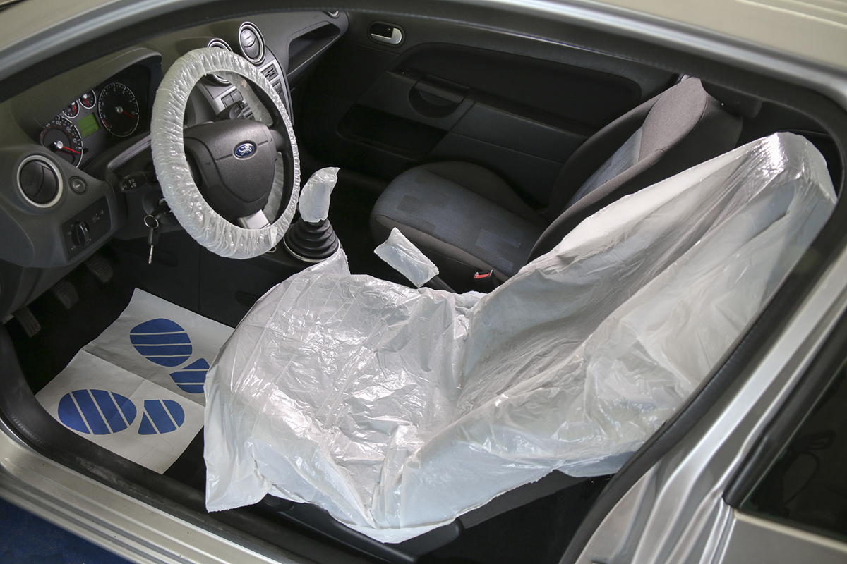 Σετ νάυλον προστασίας με κάλυμμα για το κάθισμα, το τιμόνι, τον λεβιέ, το χειρόφρενο και πατάκι.